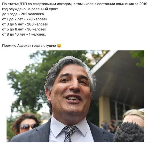 Ну да, за "пьяного" мальчика, погибшего во дворе дома, родители которого с большим трудом отстояли справедливость, "обычной" гражданке и далеко не народной артистке, певице, а также судье, депутату (этой братии, в том числе и их детям, вообще ничего не дают) и т.д. дали 3 года колонии поселения. И то благодаря шумихе, а то бы и условно отделалась. А вспомните Мару, которая по Москве уже давно без прав гоняет, так смешно часы отрабатывала на якобы принудительных работах, а судья, который в ^^овно пьяный сбил насмерть женщину с ребенком на пешеходном переходе (на видео просто вываливался из-за руля, причем не петь не лаять, хлеще Ефремова - и замяли). Да много таких случаев. И не стОит визжать, что должен ответить по закону. Наказание в нашей стране применимо только в случае если предполагаемый преступник не представляет никакой ценности/угрозы системе.