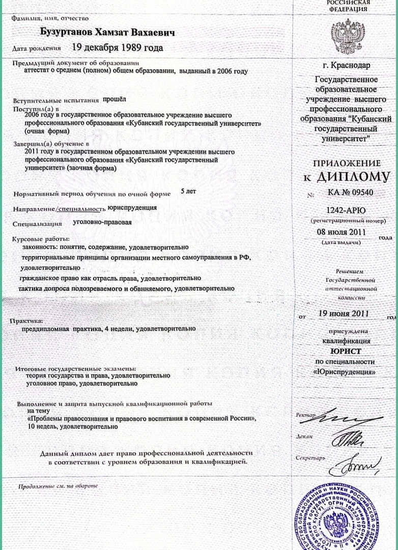 Высшее•Кубанский государственный университет•Юриспруденция•Краснодар•год окончания: 2011