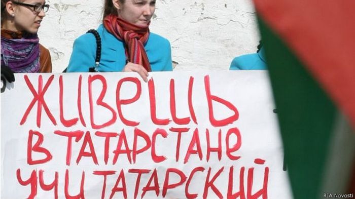 Девушка с плаката эту мину уже поставила: "Хочешь жить в Татарстане - учи татарский язык"! Все, скоро прриедет нуланд с помощниками и поддержит этот ультиматум печеньками.