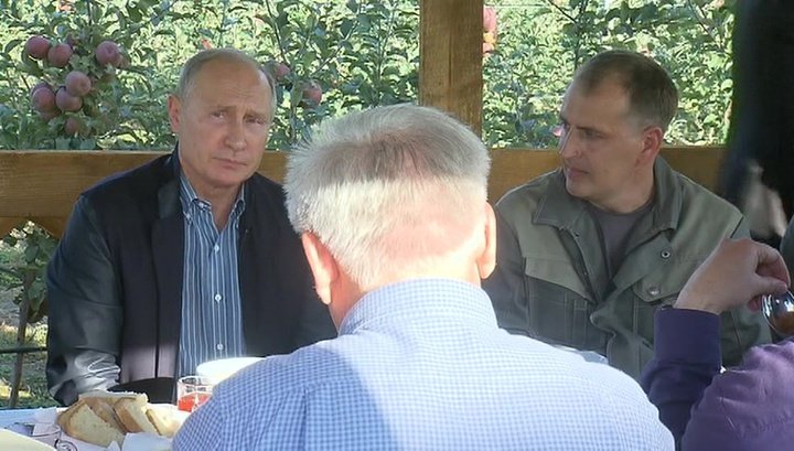В совхозе "Рассвет" на Ставрополье Путина и Медведева угостили обедом. В меню входил борщ, котлеты, пюре и компот, а также свежие яблоки, которые выращивают в совхозе.