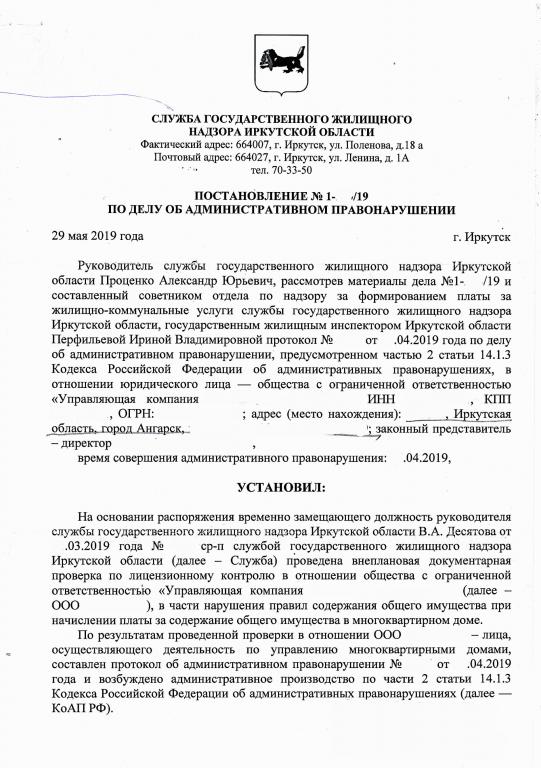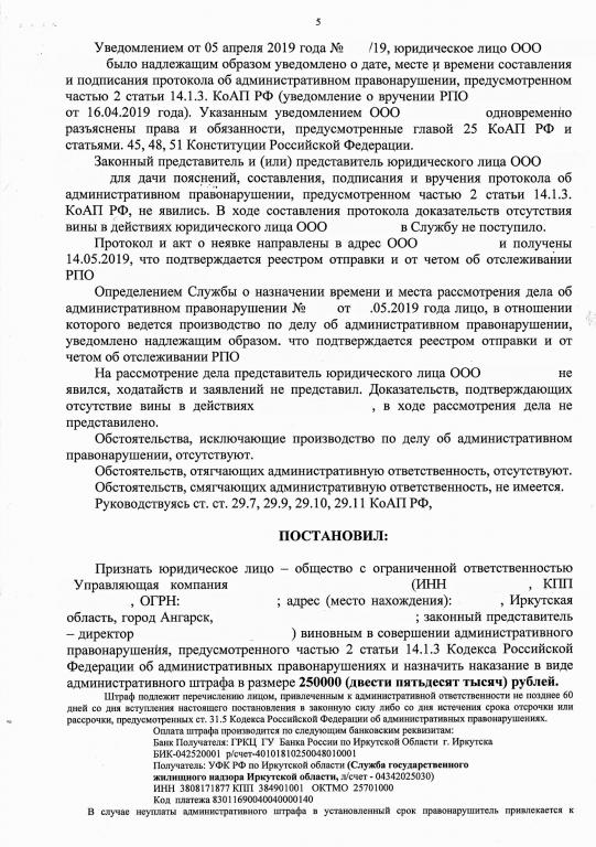 признать юридическое лицо – общество с ограниченной ответственностью «Управляющая компания (ИНН, КПП, ОГРН... ; адрес (место нахождения): ... , Иркутская область, город Ангарск... ; законный представитель – директор) виновным в совершении административного правонарушения, предусмотренного частью 2 статьи 14.1.3 Кодекса Российской Федерации об административных правонарушениях и назначить наказание в виде административного штрафа в размере 250 000 (двести пятьдесят тысяч) рублей.