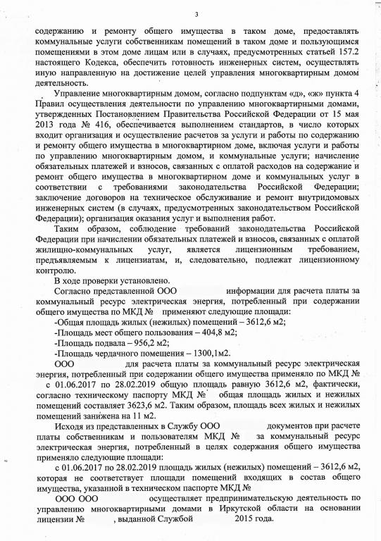 ООО для расчета платы за коммунальный ресурс электрическая энергия, потребленный при содержании общего имущества, применяло по МКД № ... с 01.06.2017 по 28.02.2019 общую площадь, равную 3612,6 кв. м, фактически согласно техническому паспорту МКД № ... общая площадь жилых и нежилых помещений составляет 3623,6 кв. м.