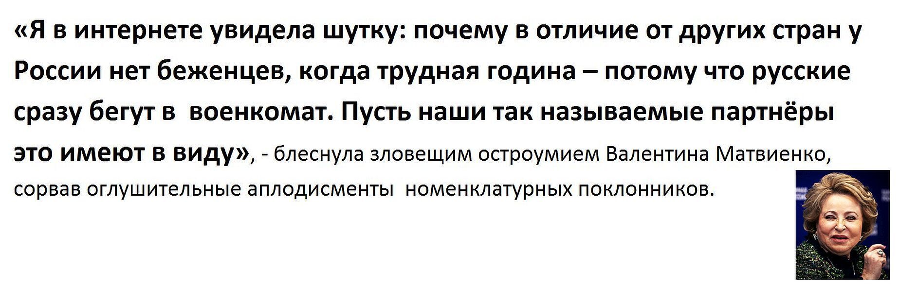 Валерий! Благодарю Вас за статью!!! Матвиенко по ходу приняла на грудь, когда выступила с таким заявлением В военкомат ДОЛЖНЫ бежать те, кто штаны протирает в тёплых креслах и кучу денег ,,зарабатывает,,...Нам, простым смертным, пофиг на власть, так же, как и им на нас.