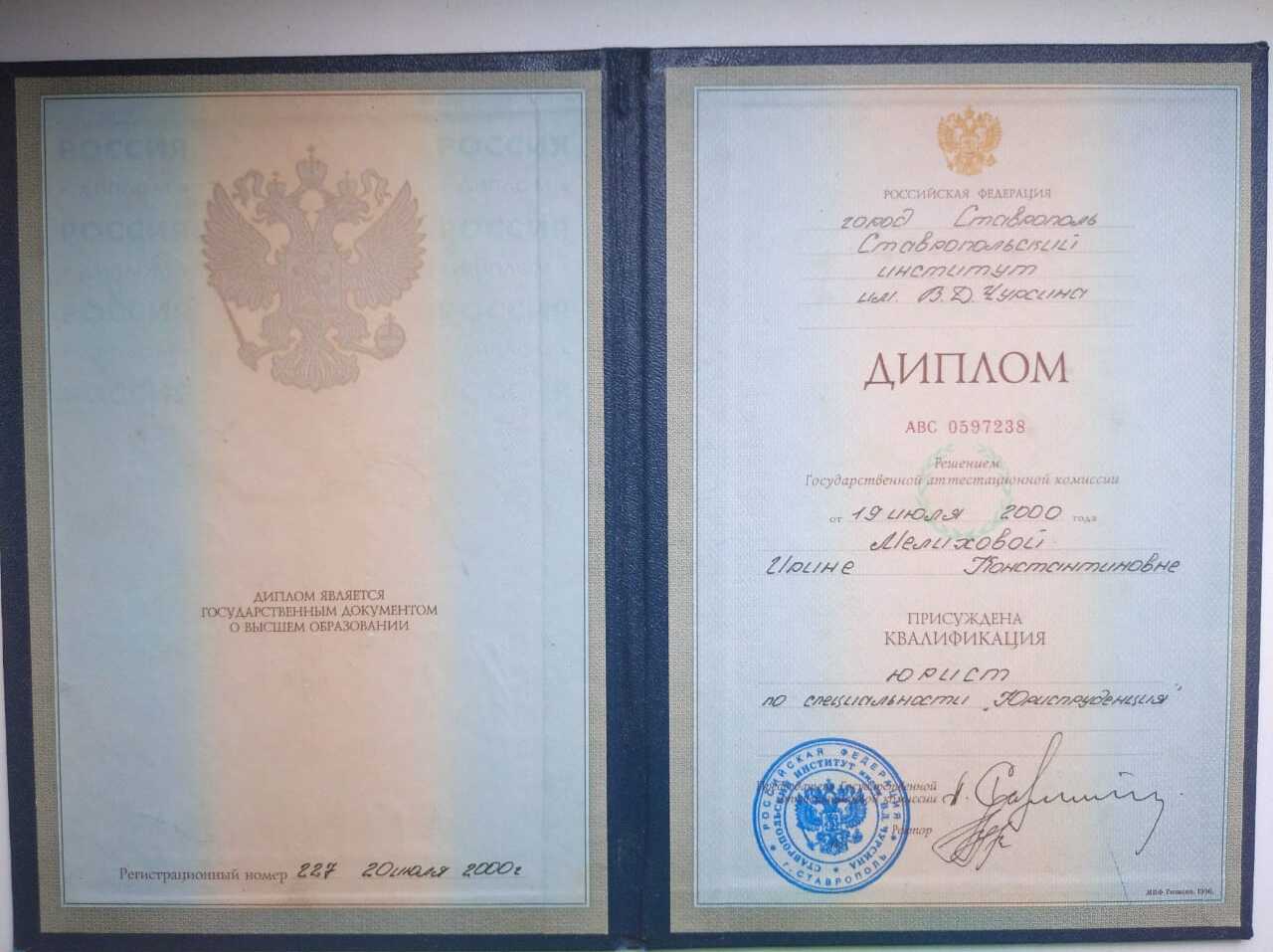 ВысшееСтавропольский институт имени В.Д. ЧурсинаЮриспруденцияСтавропольгод окончания: 2000