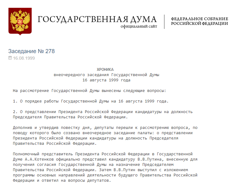 Итак, в Государственной Думе РФ, 16 августа 1999 года, "час икс" для всей страны и отправная точка для всего последующего рывка, рассматривался вопрос об утверждении на пост главы правительства РФ кандидатуры В.В. Путина.