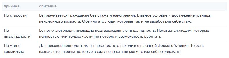 Она подразумевает гарантированную помощь со стороны органов власти незащищенных слоев. Социальная пенсия обычно минимальна, но на нее не влияет стаж или сумма страховых взносов. Получить такую помощь нельзя в периоды оплачиваемой работы.
