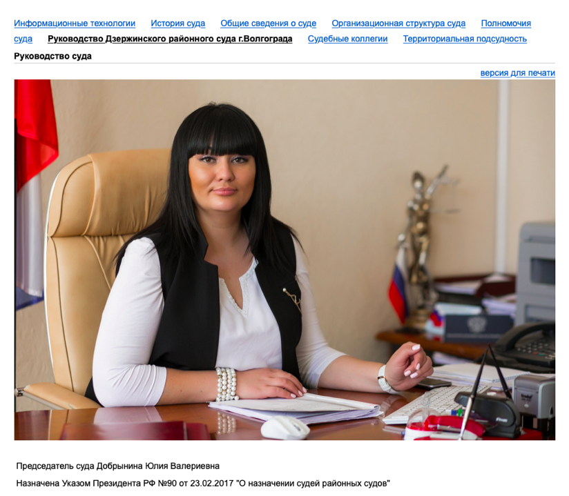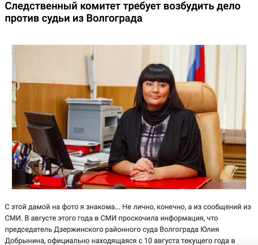 И снова здравствуйте, уважаемые подписчики, читатели и гости сайта 9111. ру! Помните августовский переполох с судьёй районного суда Волгограда Юлией Добрыниной, которая на тот момент являлась председателем Дзержинского районного суда Волгограда (!). О ней я упоминала в своей публикации от 15 сентября этого года "Как же верить нашей судебной системе? А судьи кто?".