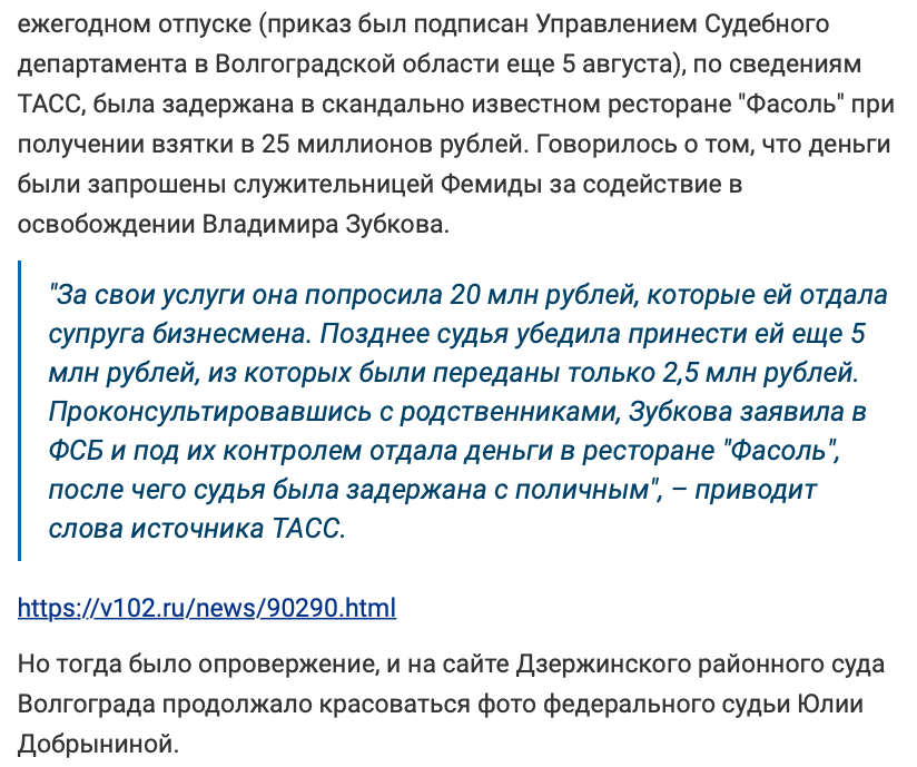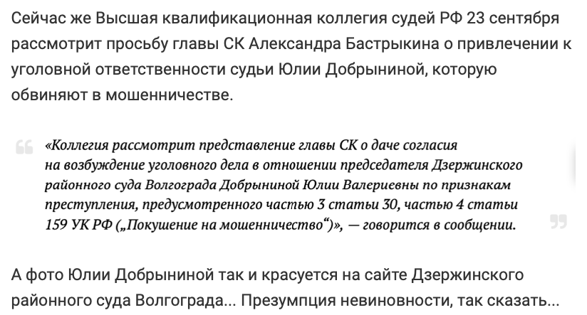 И вот сейчас, несмотря на те опровержения, что были ранее (на мой личный взгляд это дело хотели замять, и сами догадываетесь каким именно образом), ситуация с судьёй Добрыниной набрала обороты и Московский Басманный суд назначил экс-главе районного суда в Волгограде домашний арест на 2 месяца. Ей вменяется особо крупное мошенничество.
