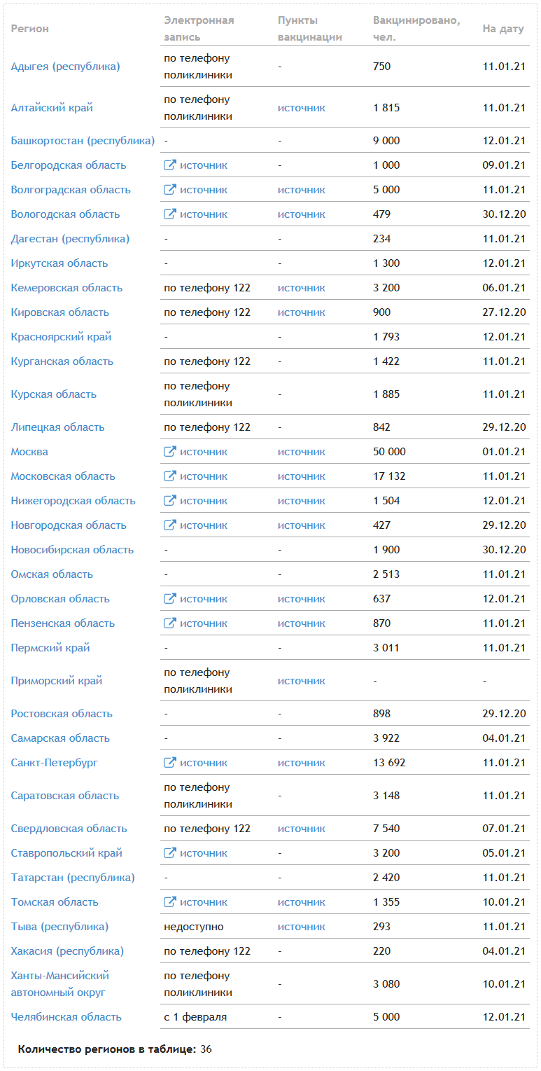Сейчас все регионы получили ограниченное количество доз вакцины для прививок приоритетных групп населения. Первым регионом, открывшим прививочные пункты, стала Москва, которая ввела следующие правила: