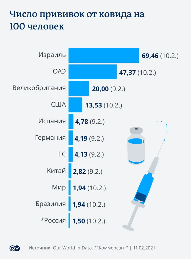 Речь идет об абсолютном количестве сделанных уколов. Если же пересчитать вакцинированных на 100 жителей, безоговорочным лидером станет Израиль. Об этом сообщается в материале DW, опубликованном в четверг, 11 февраля.