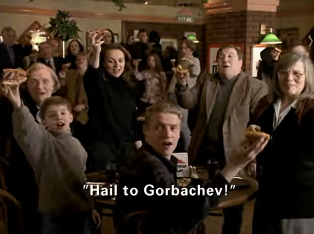 А снявшись в 1997 г. в рекламе сети пиццерий «Pizza Hut», бывший глава государства окончательно дискредитировал себя в лице простого народа. В этом рекламном ролике, доступном в Интернете, незнакомые актеры, поднимая куски пирога, благодарят Горбачева за возможность покупать пиццу.