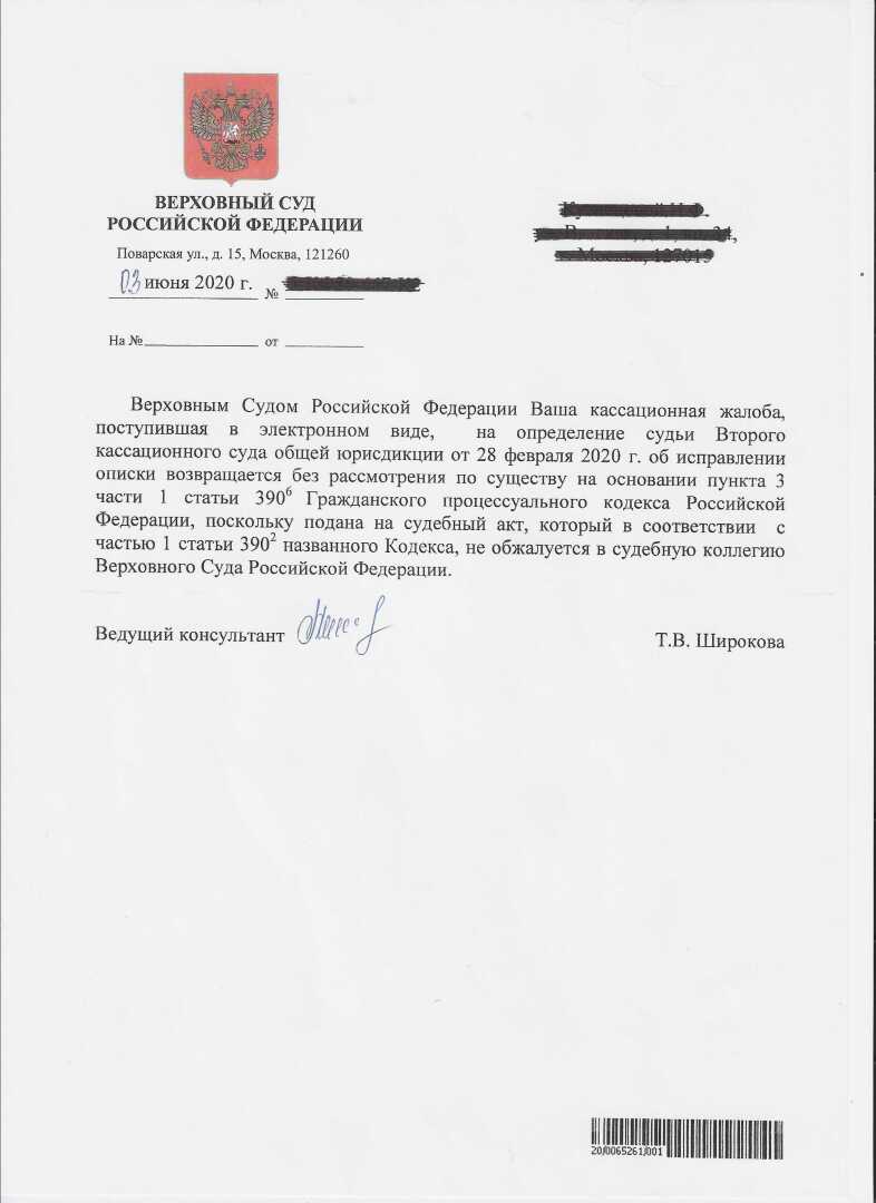 Консультанты Верховного Суда (Т.В. Широкова, Я.С. Арефьева) вдруг вообразили себя судьями, блокируют подачи процессуальных жалоб в Верховный Суд, не допускают их до рассмотрения судом, присылают их обратно, сопровождая безграмотными и имеющими целью ввести заявителя в заблуждение комментариями. На этих консультантов было подано заявление в Следственный комитет поскольку они узурпировали право судьи выносить решения по процессуальным жалобам и воспрепятствовали осуществлению правосудия с использованием своего служебного положения. Однако в Следственном комитете устроили жуткую волокиту, занимаются отписками или просто не отвечают. Подложные определения Второго кассационного суда общей юрисдикции однозначно нужно отменять, однако в Верховном Суде ищут противоправные способы этого не делать.