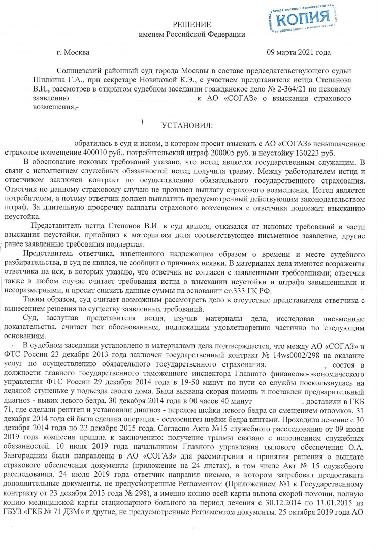 Победа госслужащего в споре со страховой компанией АО «СОГАЗ»