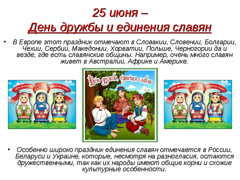 25 июня отмечается День единения и дружбы славян. Этот праздничный день был учреждён в конце ХХ века с целью сохранения исторической памяти славянских народов мира о своих корнях, о, во многом, общей истории предков. В День дружбы и единения славян в разных странах проводятся культурные мероприятия, направленные на возрождение традиций и культур наших предков.