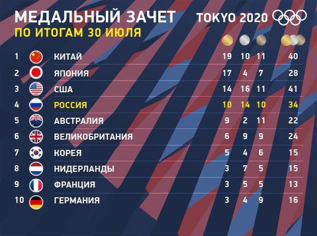 Медальный зачет на 30 июля 2021 года