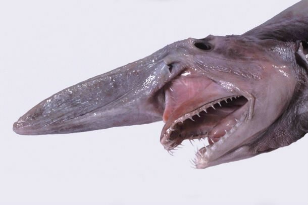 Вот эту рыбину я бы точно отнесла к фильмам ужасов. В ней действительно можно разглядеть домового, если его кто-то видел))))) и акулу. Но это еще не все. Она интересна тем, что охотясь, может выдвигать свою челюсть на 7,5 см вперед, чтобы поймать добычу. Жуть.