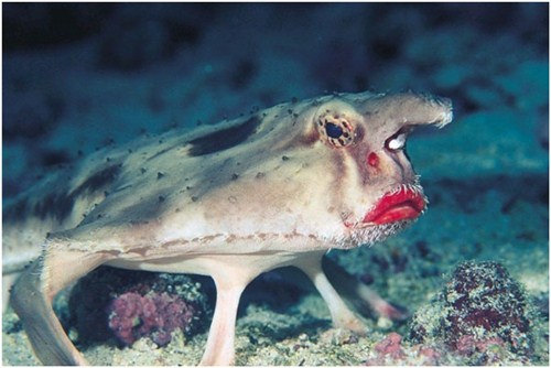 Еще одна рыбка.))) Ее называют Нетопырь Дарвина. Передние ножки, на которых она стоит, совсем не ножки, а плавники, с помощью которых она передвигается по дну! А вот губки красного цвета - это ее отличительная черта. Красотка)) Губы накрасила и пошла.)))