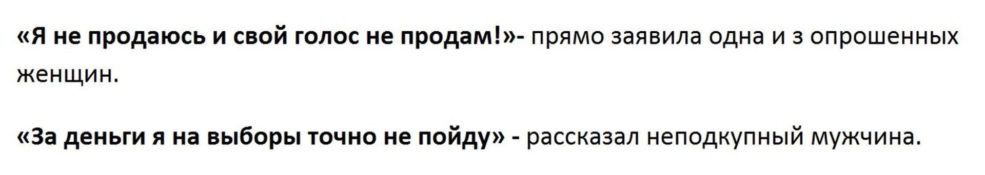 Всего лишь девять человек из двадцати категорически отказались продавать свой избирательный голос за денежные знаки, в оставшихся случаях людей волновала только сумма предлагаемая за волеизъявление.