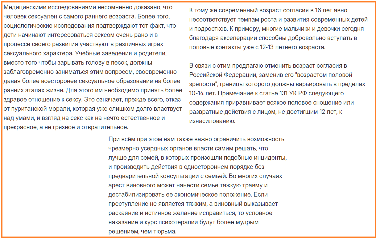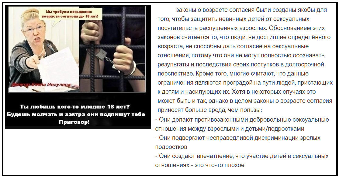 …педофильское лобби… навязывает нам мнение, что необходимо снижать возрастной уровень, когда человек может официально вступать в половые отношения с людьми старше себя, снижать возрастной уровень для законного заключения брака и так далее.