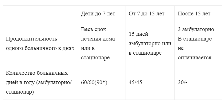 Из таблицы видно, что родственникам детей старше 15 лет рассчитывается только 3 дня по каждому заболеванию, и только в случае амбулаторного лечения. Этот срок может быть увеличен до 7 дней по решению врачебной комиссии. Лечение в больнице не оплачивается — считается, что в больнице таким взрослым детям медицинский персонал сможет обеспечить весь необходимый уход.