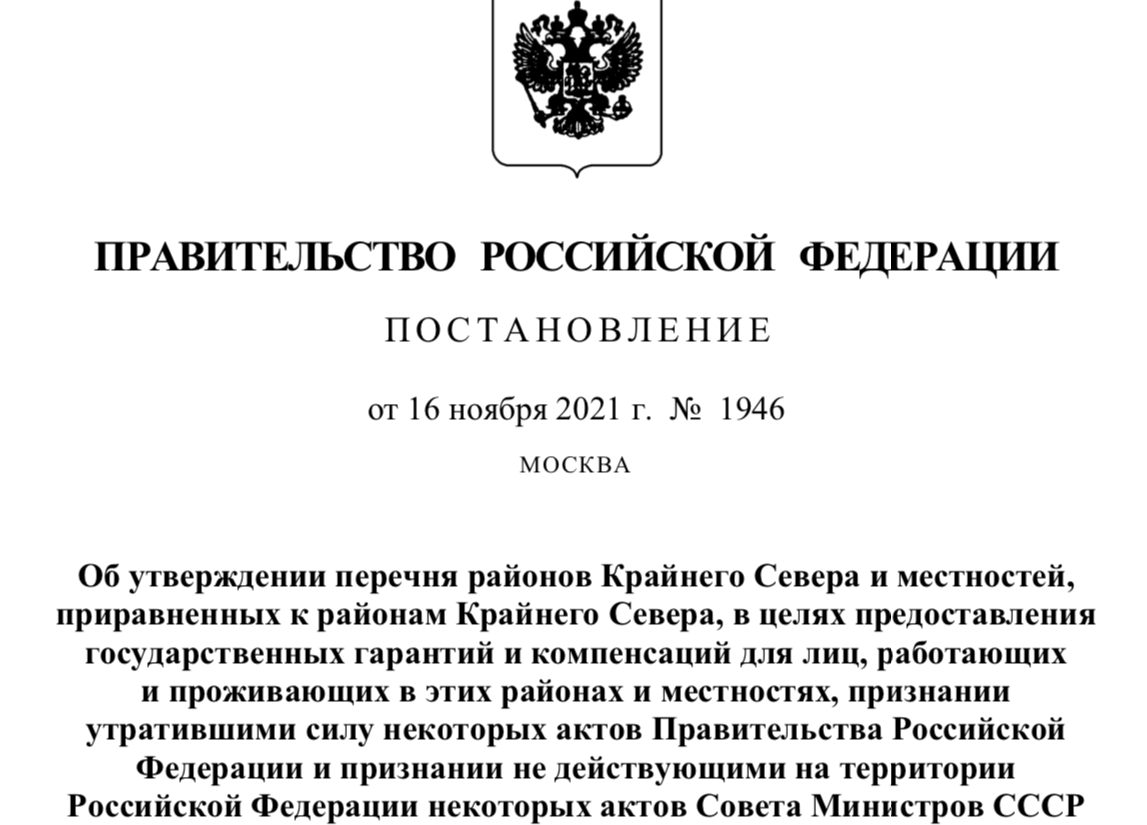 Правительством РФ ПОСТАНОВЛЕНИЕМ от 16.11.2021 года № 1946 утверждён единый перечень районов Крайнего Севера и приравненных к ним местностей. Утверждён данный перечень с целью выплат компенсаций, а также для предоставления госгарантий россиянам, проживающим на этих территориях нашей страны. В плане географии этот перечень не изменился, однако он стал на много структурированнее. Новый вариант перечня стал соответствовать современному муниципально-территориальному устройству нашей страны.