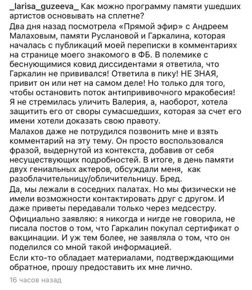 Сначала с непоколебимой уверенностью утверждает в соцсетях, что у Гаркалина «не было ни одной прививки», потом, даже не удосужившись извиниться перед семьёй покойного, заявляет, что сказала это «в пику, на зная, привит он или нет».