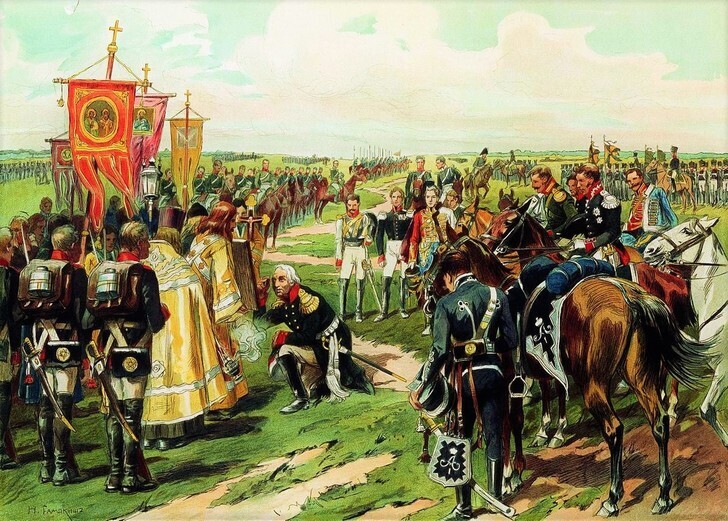 Кутузов, сдернув фуражку с седой головы, тяжело опустился на колени. За ним его генералы: Багратион, Барклай, Платов, братья Тучковы…