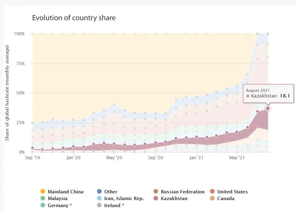 По данным Кембриджского центра альтернативных финансов, в августе прошлого года на долю Казахстана приходилось более 18% хешрейта глобальной сети биткойнов — последнего месяца, за который были доступны данные. Это второе место после Соединенных Штатов. По данным CoinDesk, хешрейт относится к общей вычислительной мощности, используемой для майнинга криптовалюты.