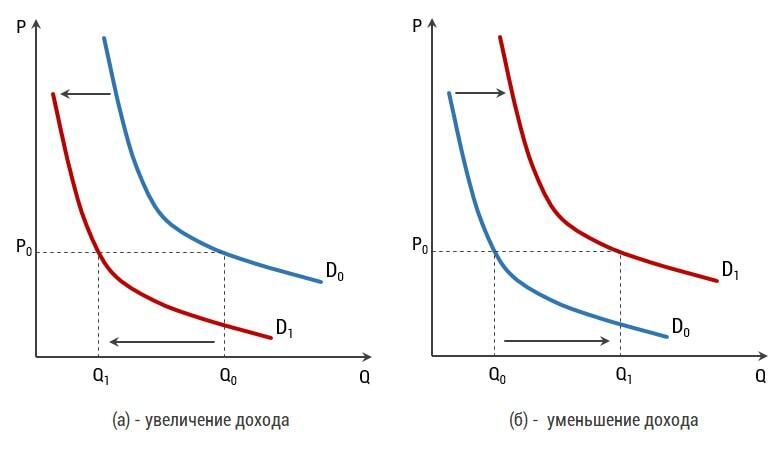 В случае с нормальными товарами увеличение доходов потребителей приводит к росту спроса на них, то есть при том же уровне цены потребители имеют возможность купить их в большем количестве. Падение доходов, напротив, приводит к снижению спроса.