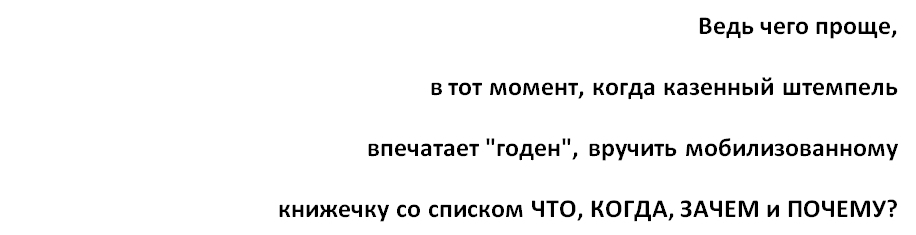 Ведь чего проще, в тот момент, когда казенный штемпель впечатает "годен", вручить мобилизованному книжечку со списком ЧТО, КОГДА и ПОЧЕМУ? Раз уж "приравнены" к контрактникам, то и контракт можно заключить? Разве, нет? И "приложение к контракту" выдать? Что не так?