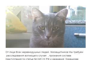 «Требуем расследования… признания состава преступления по статье №245 УК РФ («жестокое обращение с животными») и наказания Евгения Корешкова за убийство кота», - говорится в тексте документа.