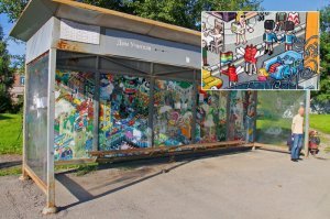 Вызвавший возмущение горожан остановочный павильон находится на улице Юбилейная. Его покрывают изображения держащихся за руку мужчин, целующихся существ, похожих на насекомых, а также нудистов.
