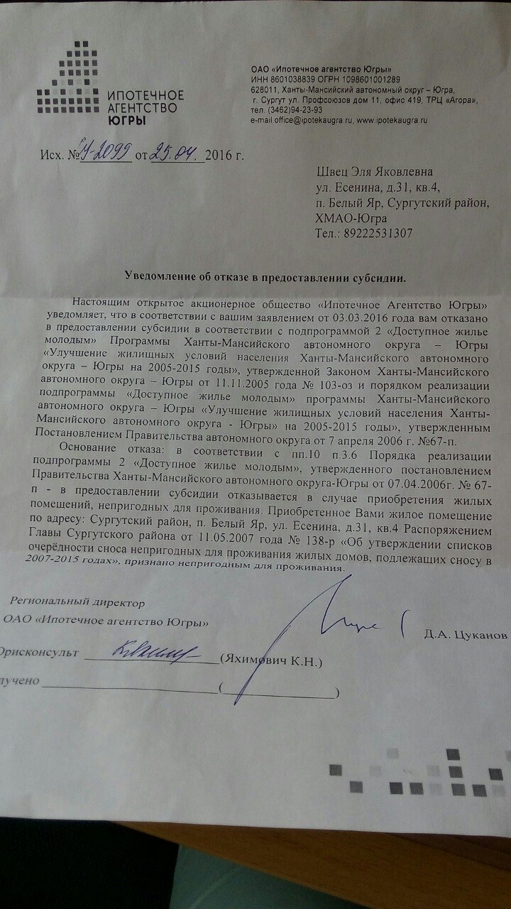 Скажите, пожалуйста, правомерно ли мне отказали в предоставлении субсидии в соответствии с программой 2 "доступное жилье молодым" программы ХМАО Югры улучшение жилищных условий населения ХМАО Югры на 2005-2015 год. Если при сдаче документов в марте 2010 года мне не сказали об ограничении по дому. Рассматривали моё заявление до 3.03.16. Я взял ипотеку с расчетом после выплаты субсидий и погашении за счет них долга по ипотеке.