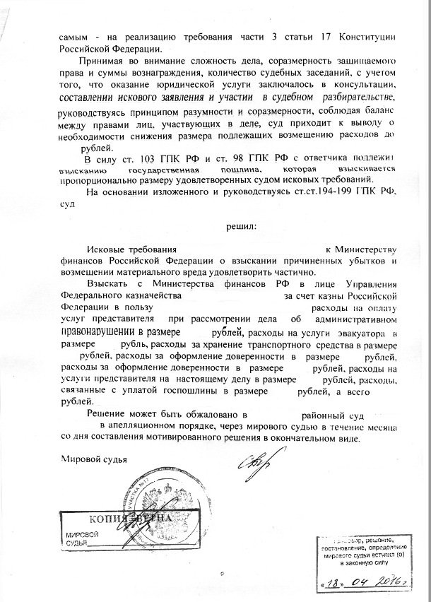 Заключаем договор, начинаем работать — сначала едем в ГИБДД, где говорят, что не знают ничего, они рассмотрение дел не отслеживают. Потом едем к мировому судье и удивляемся — в отсутствие ЛВОК дело рассмотрено, он наказан 1,7 лишения и 30 тыс. штрафа. Составляем жалобу, подаем в районный суд. Рассмотрение дела в районном суде было 3 месяца, прошло 5 заседаний, но мы постановление отменили, парня оправдали, после чего решили взыскать убытки и материальный вред с государства в лице Минфина, вызванные незаконными действиями сотрудников ГИБДД.