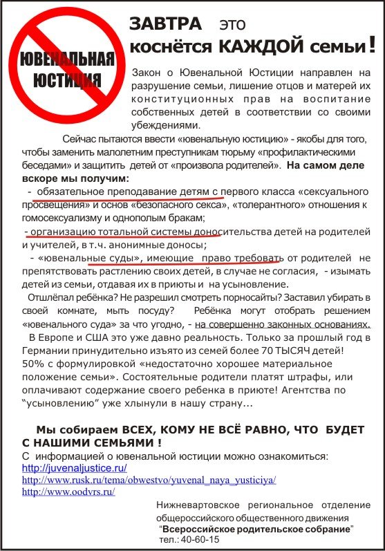 Только недавно писала статью на один сайт о разгуле ювеналов, сама сталкивалась с их неадекватностью и целенаправленными разрушительными действиями в отношении к нормальным, "классическим" семьям.Вывод прост до слёз: согласно постулатам ЮЮ, дети смогут выбирать родителей, и это будет нормой, вся окружающая информация, стиль жизни взрослых им будет говорить о том, что «родители приходят и уходят, и ребенок будет вынужден находить самоценность в себе самом (то есть компенсирует все травмы эгоизмом, нарциссизмом), либо другими патологиями. То есть на корню убивается заповедь почитания родителей, разбивается институт семьи, брака, и весь ужас в том, что под прицел ставиться самое невинное и самое ценное в любом нормальном обществе - дети. Что будет с обществом, если начать его разложение с самого слабого звена?
