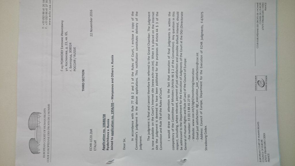 В 2007 г Белгородская Фемида нарушила право моей клиентки на справедливое разбирательство дела независимым и беспристрастным судом, созданным на основании закона. Европейский Суд по правам человека признал Российскую Федерацию виновной в нарушении ст. 6 п.1 Конвенции о правах человека и основных свобод и присудил ей справеливую компенсацию в размере 1500 €. Решения белгородских судей будут отменены, дело клиентки в споре о праве собственности на полквартиры будет пересмотрено.