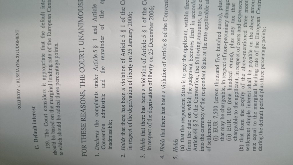 Решением Европейского Суда по правам человека от 31.01.2017 по моей жалобе 38898/04 Российская Федерация признана виновной в нарушении ст. 5 (дважды) и ст. 8 Конвенции о защите прав человека и основных свобод с присуждением компенсации 7600 €.