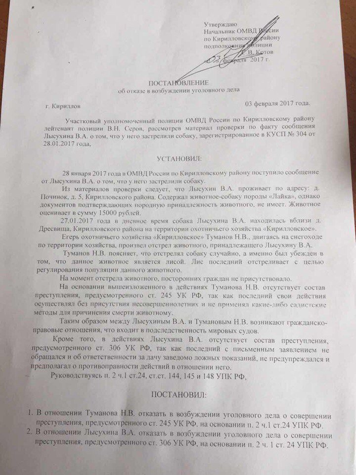 27 января 2017 года, егерь охотничьего хозяйства "Кирилловское" Туманов Н.В. застрелил собаку Лысухина В.А. Позже, он дает объяснение, дескать, думал что это лиса, и дело закрывается.