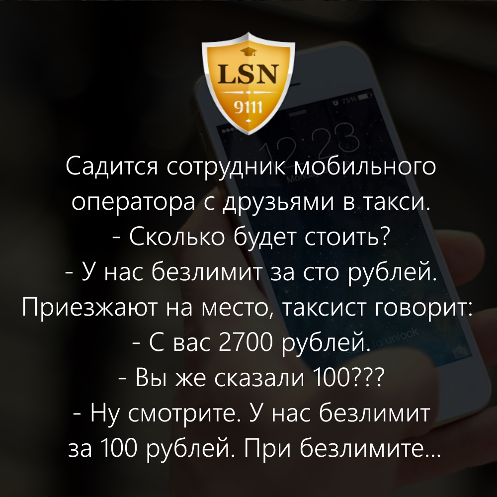 - Ну смотрите. У нас безлимит за 100 рублей. При безлимите ограничена скорость - 10 км/ч. Вы просили ехать побыстрее. Это вам стоило дополнительные 100 рублей за каждые 10 км/ч. Кроме того, безлимит у нас действует только в пределах района. Вы заказали поездку в соседний район, а это уже внутригородской роуминг. Выезд за пределы домашнего района стоит 300 рублей. Более того, во внутригородском роуминге у нас начинается оплата по километрам и мы списываем сумму сразу за 100 километров, это еще 1000. Что значит "дорого"? Обычный тариф у нас 15 руб/км, а тут получается 10. Дешевле же! Кроме того, вы разделили наше такси с друзьями. С 1 января эта услуга платная - дополнительные 200 рублей с человека. И еще 400 рублей мы сняли с вас за прослушивание музыки, т.к. садясь в такси, вы выразили согласие на получение платного музыкального контента. Так что все верно, с вас 2700!