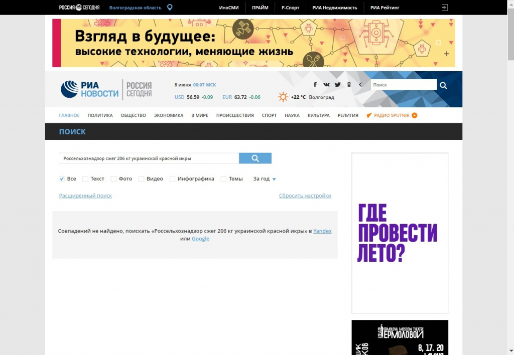 Решил проверить, пришёл к выводу, что даная новость является фейком. Вот по этой ссылке – МК ссылается на РИА Новости, что это они, мол, сообщают о сожжённой икре – www.mk.ru Дата 06 06 2017 в 17:07. Смотрим сайт РИА Новости, на которые ссылается МК, находим 06 06 2017, время 17:07 – в указанное время там НЕТ новостей! Есть 17:05 Прохоров снимется в продолжении комедии "О чем говорят мужчины", далее идёт Трамп заявил о возможном "конце ужасов терроризма" после скандала с Катаром. Время новости – 17:0806.06.2017