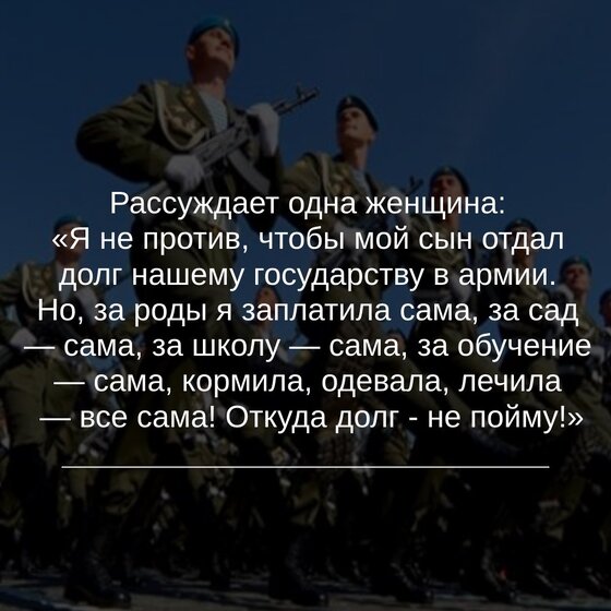Это не анекдот, а реалии современной жизни. Наша армия, как и когда то на заре советской власти, вновь стала рабоче-крестьянской. А как бывший офицер хочу добавить, что с одной стороны хорошо, что сынки чиновников и пр. не попадают в армию., потому что в армии они ведут себя точно так же как и мажоры на автодорогах, тем самым разлагая дисциплину и деморализуя личный состав. Единственно хотел бы добавить, что надо принять закон, что гражданин не отслуживший положенный срок в армии, не имеет право занимать государственные должности, служить в правоохранительных органах и избираться в представительские органы власти, как это сделано в Израиле и Армении.