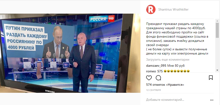 В качестве подтверждения СМИ прикладывали скриншот с телепередачи Д. Киселева. На него с помощью Фотошопа добавили фотографию президента и текст о том, что планируется раздать 4000 рублей каждому россиянину. Сделано это было не слишком профессионально, но многие поверили.