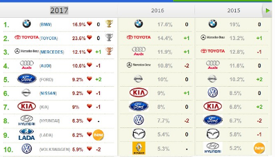 На третьем месте – Mercedes-Benz, на четвертом-Audi. Замыкает пятерку Ford. За ним следуют Nissan и KIA. Все они не попали в первую двадцатку абсолютного рейтинга.