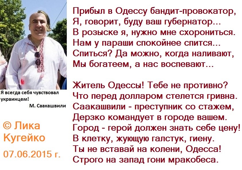 Да и обещал съесть свой галстук-и надо же съел, не то что у нас обещают много, в том числе голову на рельсы, если цены вырастут. Подал в отставку с поста губернатора Одессы и не остался с приставкой И.О., и не пересел в другое лакомое кресло. Не хочу, чтоб он стал президентом Украины - у России будет с ним проблем больше, чем с Порошенко.
