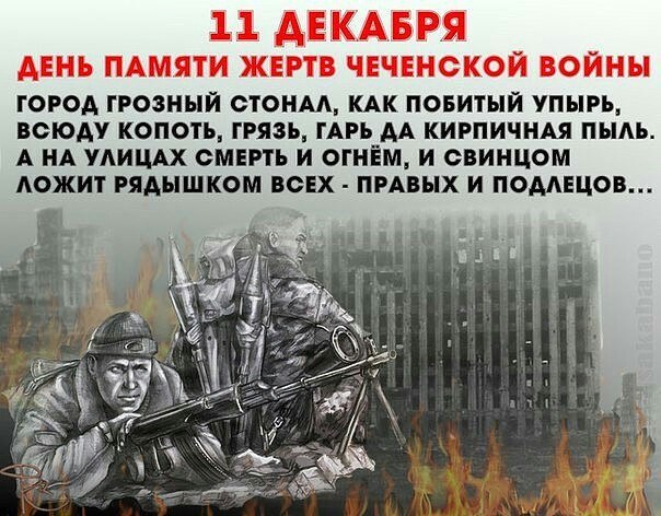 Сегодня, 11 декабря отмечается День памяти погибших в вооружённом конфликте в Чечне. По всей стране проходят панихиды по погибшим, а также уроки мужества, классные часы, выставки и экспозиции. С момента начала боевых действий в Чечне прошло 23 года. Одиннадцатого декабря 1994 года первые эшелоны российских войск вошли в Чечню для «восстановления конституционного порядка» на территории Чеченской республики. Штаб Объединённой группировки федеральных сил приводил такие цифры потерь: 4103 человека убиты, 1231 пропали без вести, дезертировали или взяты в плен, 19 794 ранены. По данным Комитета солдатских матерей, потери составили не менее 14 000 человек - убиты. Это задокументированные случаи гибели, по данным матерей погибших военнослужащих. Однако следует учитывать, что данные Комитета солдатских матерей включают в себя только потери солдат-срочников, без учета потерь военнослужащих-контрактников, бойцов специальных подразделении и прочих. Потери боевиков, согласно данным российской стороны, составили 17 391 человек. Число потерь мирного населения доподлинно неизвестно.