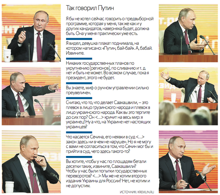 Это была пресс-конференция не кандидата – а кандидатом Путин объявил себя всего несколько дней назад, – но уже победителя выборов. Программа? Программа наверняка есть, должна быть, практически уже есть, сказал Путин – но в ней ли дело? Конкуренция? Конечно, должна быть, но ее нет, потому что не считать же программой то, в чем нет «позитивных действий», реальной, а не «эфемерной, крикливой» повестки. Не выращивать же, действительно, оппозицию самому.
