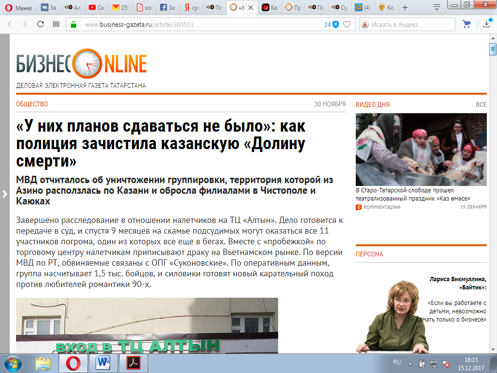 В результате в этих публикациях с громкими названиями перед нами раскрылась просто таки фееричная картина с развернувшейся организованной преступностью на территории Казани, которой бравые казанские полицейские объявили войну. Поводом к этому послужило скандально известное дело с так называемым погромом ТЦ «Алтын», раскрученным именно с подачи этого информационного портала, как нападение ОПГ и криминальные разборки в духе 90 х. О подробностях высосанного из пальца содержания этого дела, а так же полицейском произволе я уже писал ранее https://echo.msk.ru/blog/zlatoalex/2016952-echo/ . Разумеется, замашки шпаны этих взрослых и вполне состоявшихся молодых парней не красили, но и их мелко хулиганский поступок, с погромом витрин в торговом центре никак не тянет на присвоение им статуса крутых братьков по типу сериала «Бригада», о чем очень серьезно позаботилось вышеназванное агентство.