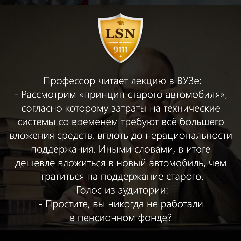 - Рассмотрим «принцип старого автомобиля», согласно которому затраты на технические системы со временем требуют всё большего вложения средств, вплоть до нерациональности поддержания. Иными словами, в итоге дешевле вложиться в новый автомобиль, чем тратиться на поддержание старого.