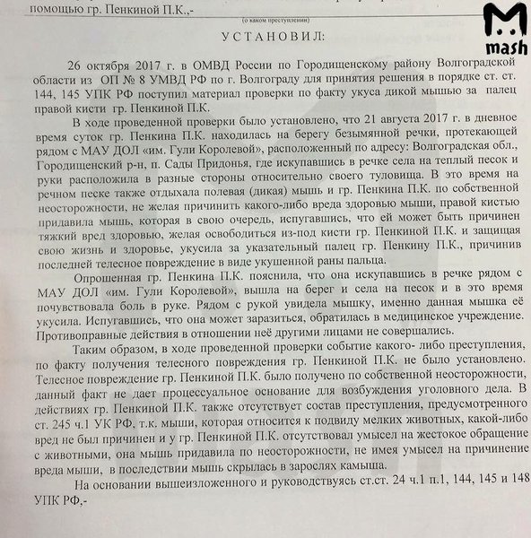 Автор неизвестен, хотя ситуация понятна. Пришла в полицию телефонограмма о травме гражданки Пенкиной. Столоначальник чиркнул резолюцию: "Для решения в порядке ст.ст. 144-145 УПК РФ". Ну, и участковый, опер или дознаватель так изящно отписался. Но до "отказного" 1979 года (Сюжет про поросёнка Борю) ему, конечно, далеко! Сюжет мною выложен.