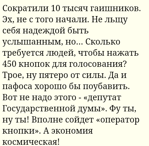 Представить , вкусивших максимум удобств , Депутатов на эскалаторе в метро, или трясущихся в переполненных автобусах , ПРОСТО НЕВОЗМОЖНО!